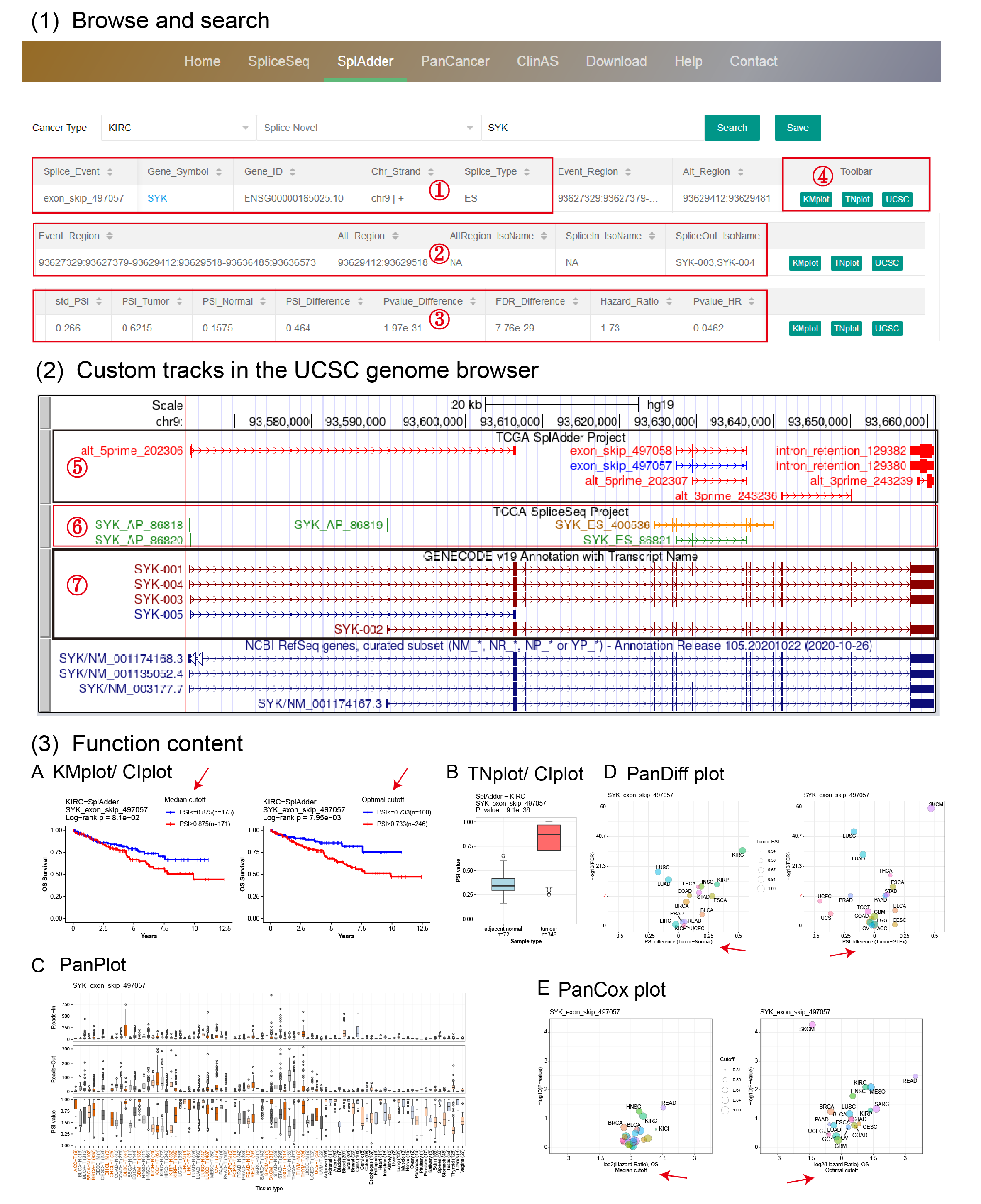 (1) After choosing a cancer type and searching a gene symbol, users can browse an integrative information of the queried splice events, including gene information ①, events information ② and statistical results ③. By clicking on a gene symbol embeded with the hyperlink, users are directed to the Ensembl database. In the button region ④, by clicking on the "UCSC" button users are directed to the UCSC genome browser, which is characterized by customized tracks with annotated structure of transcripts ⑦, and explanatory diagrams ⑤ ⑥ of detected AS events in the SplAdder and SpliceSeq projects. By clicking on a plot button, corresponding plot of querying will be presented in few seconds. ① and ② are consistently presented in different pages such as "SpliceSeq", "SplAdder", "PanCancer" and "ClinAS", while ③ and ④ might be different among them. For the SplAdder project, event region in ② was organized orderly by three or four exons (0 base start to end) based on chromosome locations from 5' to 3' and linked by "-", and alternate region was characterized as 0 base start to end of longer intron (A3 and A5), longer exon (IR) or alternate exon (ES and ME).