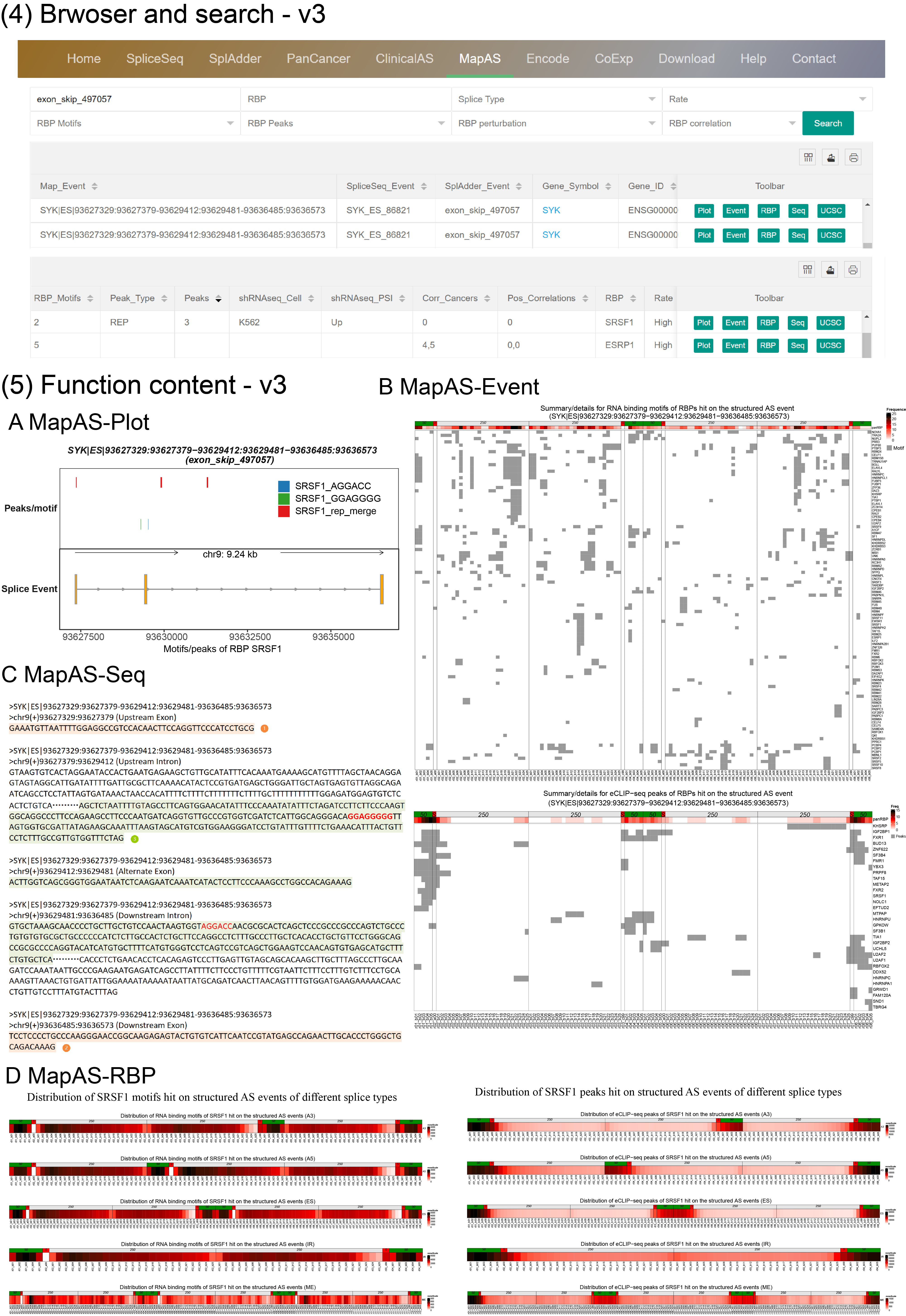 (4) Browser and search By entering a splice gene, AS event or RBP on the MapAS page, users can view essential information of AS events, along with integrative data regarding hundreds of RNA-binding proteins (RBPs). The column "RBP_Motifs" indicates the number of RBP motifs identified in the queried AS event. "Peak_Type" and "Peaks" display the type and number of RBP peaks mapped to the event. The "shRNAseq_Cell" and "shRNAseq_PSI" columns represent the cell type and the corresponding PSI changes of the queried AS event, respectively. "Corr_Cancers" and "Pos_Correlations" list the number of cancers or tissues showing significant correlations and positive correlations, respectively. If two numbers are separated by a comma in the "Corr_Cancers" and "Pos_Correlations" columns, they represent data from the SpliceSeq and SplAdder projects, respectively. A "0" or "." in these fields denotes that the AS event has been explored, but no significant correlations were found, while an empty value ("") signifies a lack of supporting data.