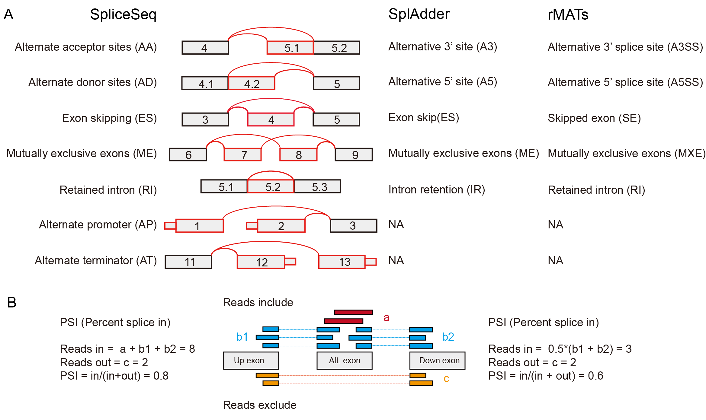 (2) Three customized tracks are provided in the UCSC genome browser, presenting explanatory diagrams and annotated structure of transcripts in the SplAdder and SpliceSeq projects. In the explanatory diagram track for SplAdder ⑤ and SpliceSeq ⑥, AS events in Blue or Green are indicated as annotated known AS events while AS events in Red or Orange are indicated as novel AS events. In the structural transcripts track for GENECODE v19 ⑦, transcripts in DarkRed are indicated as protein coding while transcripts in DarkBlue are indicated as non-protein coding. Thick blocks are indicated as alternate exon/exons of an AS event in the tracks with explanatory diagrams of AS events and are indicated as CDS region of a transcript in the tracks with annotated structure of transcripts.